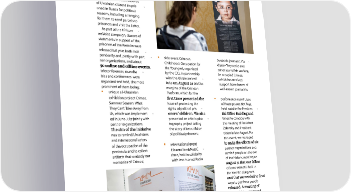 WWW.CCL.ORG.UA During the reporting period, steady organizational, legal and material support was provided to the relatives of Ukrainian citizens impris - oned in Russia for political reasons, including arranging for them to send parcels to prisoners and visit the latter. As part of the #Prison - ersVoice campaign, dozens of statements in support of the prisoners of the Kremlin were released last year, both inde - • side event Crimean pendently and jointly with part - Svoboda journalist Vla - ner organizations, and about Childhood: Occupation for dyslav Yesypenko and , the Youngest, organized other journalists working teleconferences, roundta - by the CCL in partnership in occupied Crimea, bles and conferences were with the Ukrainian Insti - which has received organized and held, the most support from dozens of prominent of them being: margins of the Crimean well-known journalists; • unique all-Ukrainian Platform, which for the • performance event Lives exhibition project Crimea. Summer Season: What issue of protecting the of Hostages Are Not Toys, They Can’t Take Away from rights of political pris - held outside the Presiden - Us, which was implement - ed in June-July jointly with presented an artistic pho - timed to coincide with partner organizations. tography project telling the meeting of President the story of ten children Zelensky and President was to remind Ukrainians of political prisoners; Biden in late August. For and international actors • international event this event, we managed of the occupation of the peninsula and to collect #JournalismIsNotaC - partner organizations and artifacts that embody our rime, held in solidarity remind people on the eve memories of Crimea; with imprisoned Radio of the historic meeting on citizens were still held in the Kremlin dungeons ways to get these people human rights activists and representatives of relevant public authorities was held was initiated by the Presi - to our August event.