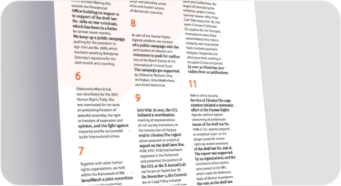 online campaign in which Belarusian students expelled former prisoners called on from their homeland for teleconferences, round - tables and conferences, the paign was joined by univer - largest of them being the event entitled Waiting Kills sities and student unions exhibition project Crimea. outside the Presidential of democratic countries. Summer Season: What They Can’t Take Away from Us, side event Crimean Childhood: Occupation for the Youngest, international event #Jour - for almost seven months. As part of the Human Rights nalismIsNotaCrime, held in Agenda platform, we conduct - solidarity with imprisoned pushing for the president to Radio Svoboda journalist sign the Law No. 2689, which participation of veterans and Vladyslav Yesypenko and has been awaiting Volodymyr - other journalists working in Zelensky’s signature for the tion of the Rome Statute of the occupied Crimea and joined sixth month and counting. International Criminal Court. - by Oleksandr Matiash, Dmy - tro Krykun, Alina Mykhailova, and Andrii Kozinchuk. Oleksandra Matviichuk was shortlisted for the 2021 Reform of the Security Human Rights Tulip. She - was nominated for her work on protecting freedom of peaceful assembly, the right Agenda coalition experts to freedom of expression and meeting of representatives concerning all problematic of civil society institutions on impunity and for accountabil - the introduction of the jury 3196-d. CCL experts prepared ity for international crimes. - an analytical report on the zation prepared an analytical danger posed for human rights by certain provisions 4190, 4191, 4192 that had been registered in the Parliament Together with other human and presented the position of rights organizations, we held - conclusions of our experts within the framework of #Be - cial Forum on September 30. were passed to the MPs, - which made the Verkhovna hearing on the protection tee on Legal Policy included Rada of Ukraine to postpone of human rights of citizens of the Republic of Belarus on the committee’s agenda. Thanks to our consoli - seeking protection in Ukraine. - usian Students’ Association, for Law No. 6104 concern - the #BelarusWatch campaign ing support for political launched an international As part of the #PrisonersVoice prisoners of the Kremlin. campaign of solidarity with campaign, we held about