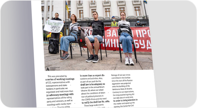 This was preceded by - footage of real war crimes cussions and activities. Also, committed in the Donbas of CCL representatives with as part of our push for the since the start of the Russian statespersons and stake - aggression was projected holders; in particular, we took part in the annual forum onto the building of the organized and held more than Ukraine 30, where we talked Verkhovna Rada of Ukraine. about the conditions of deten - Contrary to our expectations, representatives of the ruling tion of political prisoners in the long-awaited signing did party and veterans, as well as the COVID-19 era and the need not take place in early June. meetings with media repre - sentatives, Director of the Three large-scale events the matter and speed up the were held as part of the cam - signing, the Center for Civil organization repeatedly raised paign in the reporting year. Liberties held another per - the issue of the need to ratify On May 15, an event with formance event on August 19, the law at various national and - entitled Waiting Kills, which international venues. During tion was organized outside called for the immediate the campaign in support of the Verkhovna Rada building in support of the law on which by that time spent over we organized and participated
