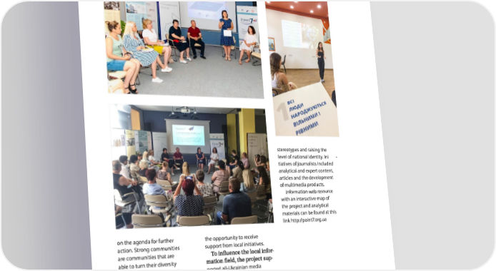 stereotypes and raising the level of national identity. Ini - tiatives of journalists included analytical and expert content, articles and the development of multimedia products. Information web resource with an interactive map of the project and analytical materials can be found at this link http://point7.org.ua on the agenda for further the opportunity to receive action. Strong communities support from local initiatives. are communities that are - able to turn their diversity - into an advantage and unite ported all-Ukrainian media around their own well-being. initiatives in the framework Besides advocacy activ - of the Equal and Free com - ities, the project includes petition. Based on the results educational programs, youth of the competition, cross-re - camps and democracy schools gional journalist teams created and published ma - active participants have terials aimed at overcoming