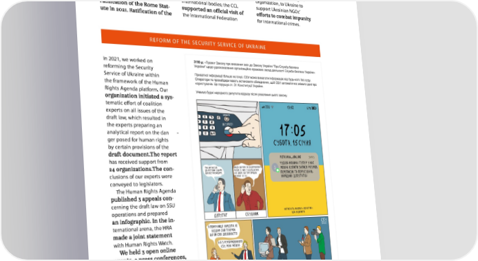 discussions online. Overall, statute remains on the agen - for Human Rights (FIDH), the the Human Rights Agenda da of the Center’s meetings world’s oldest human rights with public authorities and organization, to Ukraine to and events in support of the international bodies; the CCL support Ukrainian NGOs’ - the International Federation for international crimes. REFORM OF THE SECURITY SERVICE OF UKRAINE In 2021, we worked on reforming the Security Service of Ukraine within the framework of the Human Rights Agenda platform. Our - tematic eort of coalition experts on all issues of the draft law, which resulted in the experts preparing an analytical report on the dan - ger posed for human rights by certain provisions of the has received support from - clusions of our experts were conveyed to legislators. The Human Rights Agenda - cerning the draft law on SSU operations and prepared - ternational arena, the HRA with Human Rights Watch. - lematic issues of the draft law and reform in general. representatives of minis - tries, the Prosecutor Gen - eral’s Oce, and the SSU.