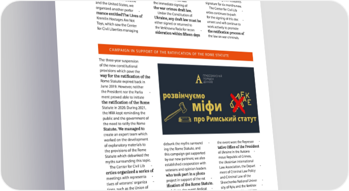 WWW.CCL.ORG.UA by the head of state. Shortly to bring together many human rights organizations. been awaiting the President’s 28, on the eve of the meeting One of the demands was signature for six months now. of the Presidents of Ukraine the immediate signing of The Center for Civil Lib - and the United States, we erties continues to push organized another perfor - Under the Constitution of for the signing of this doc - ument and will continue to Kremlin Hostages Are Not either signed or returned to work actively to promote Toys, which saw the Center the Verkhovna Rada for recon - for Civil Liberties managing the law on war criminals. CAMPAIGN IN SUPPORT OF THE RATIFICATION OF THE ROME STATUTE The three-year suspension of the new constitutional provisions which pave the Rome Statute expired back in June 2019. However, neither the President nor the Parlia - ment proved able to initiate Statute in 2020. During 2021, the HRA kept reminding the public and the government of the need to ratify the Rome create an expert team which worked on the development of explanatory materials to debunk the myths surround - the event were the Represen - the provisions of the Rome ing the Rome Statute, and Statute which debunked the this campaign got supported of Ukraine in the Autono - myths surrounding this topic. by our new partners; we also mous Republic of Crimea, The Center for Civil Lib - established cooperation with the Ukrainian International veterans and opinion leaders Law Association, the Depart - meetings with representa - ment of Criminal Law Policy tives of veterans’ organiza - project in support of the rat - and Criminal Law of the tions, such as the Union of Shevchenko National Univer - Veterans of Ukraine, the Legal A three-day event dedicat - sity of Kyiv, and the Verkhov - Hundred, the Geneva Ap - ed to the Day of International na Rada Committee on Law peal, Sich-Dnipro, the Space Criminal Justice, which in - of Opportunities, and the engaged domestic and inter - Veteran Hub, to clarify the and applied research online national experts and scholars, Rome Statute provisions and activities entitled the Week legislators, law enforcement of International Criminal an information campaign to 1,785 persons watched the