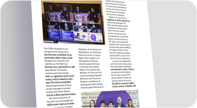 Ukraine, the representative of the President of Ukraine in the Autonomous Republic of Crimea, the State Service for Ethnic Policy and Freedom of Conscience of Ukraine. Together we were able to various pressing topics of 2021: women’s rights and the Istanbul Convention, police reform, feminist studies, activist security, personal data protection, transitional justice, environmental law, IDP rights, social work with students from certain areas of Donetsk and Luhansk oblasts, The COVID-19 epidemic has Integration of the Ministry of the rights of ethnic minori - changed some things, but it Digitalization, the Verkhovna ties and indigenous peoples, - Rada Committee on Human judicial reform, issues of his - - Rights, Deoccupation and torical memory and politics. lenge for the Center for Civil Reintegration of Tempo - Last year, we collaborated Liberties, so the #Non-Con - rarily Occupied Territories with the human rights group in Donetsk and Luhansk SICH and Suspilne Television show format. This format Oblasts, the Autonomous - involved panel discussions Republic of Crimea and the mentaries entitled Fighters - City of Sevastopol, National for the Truth as part of the - Minorities and Interethnic Non-Conference. These are Relations, the Ministry of personal stories of success - allowed participants to focus Reintegration of the Tempo - on key messages to provide rarily Occupied Territories of viewers with more informa - The technical partner of the event was Hromadske.UA, rights organizations became partners in organizing online also attended by represen - tatives of public authorities, namely the Prosecutor Gen - eral, NABU, Director General of the Directorate for Strate - gic Planning and European