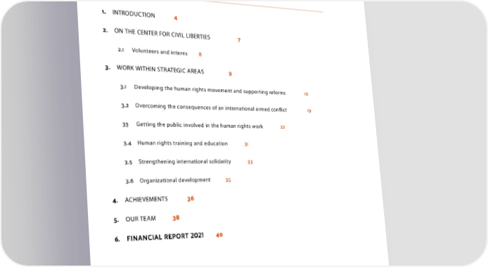 TABLE OF CONTENTS INTRODUCTION ON THE CENTER FOR CIVIL LIBERTIES Volunteers and interns WORK WITHIN STRATEGIC AREAS Developing the human rights movement and supporting reforms Overcoming the consequences of an international armed conict Getting the public involved in the human rights work Human rights training and education Strengthening international solidarity Organizational development ACHIEVEMENTS OUR TEAM