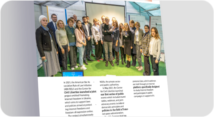 WWW.CCL.ORG.UA PROMOTING INTERNET FREEDOM IN UKRAINE In 2021, the American Bar As - NGOs, the private sector personal data, which webinars sociation Rule of Law Initiative and public authorities. are held through an Internet (ABA ROLI) and the Center for In May 2021, the Center for Civil Liberties launched to study Internet freedom project entitled Promoting and participate in public Internet Freedom in Ukraine, events which included round campaigns in support of it. which aims to support laws tables, webinars, and joint and policies aimed at protect - advocacy events to defend ing Internet freedoms and democratic principles and freedom of expression online. - The project simultaneously net space administration. works in three areas, namely The CCL Training Hub has strengthening expertise launched the Internet Free - in Internet freedom and dom Club program, which national security, increasing the capacity of Ukrainian Internet freedom, freedom of NGOs to protect and promote speech on the Internet, media Internet freedom, and stim - literacy, critical thinking de - ulating interaction between velopment, and legislation on