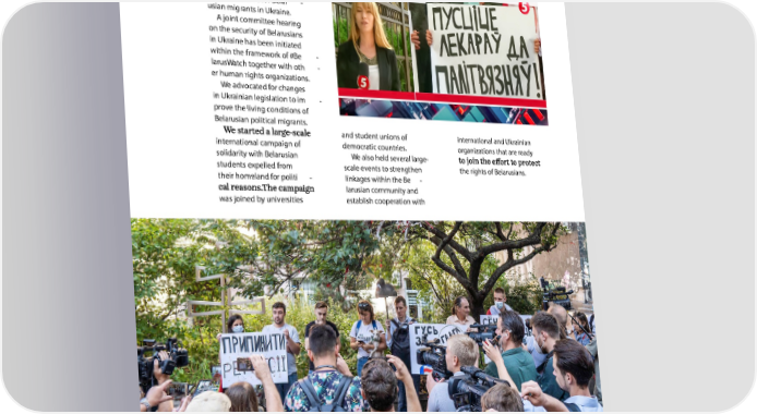 WWW.CCL.ORG.UA Major Ukrainian media mentioned these events over - cational lectures for Belar - usian migrants in Ukraine. A joint committee hearing on the security of Belarusians in Ukraine has been initiated within the framework of #Be - larusWatch together with oth - er human rights organizations. We advocated for changes in Ukrainian legislation to im - prove the living conditions of Belarusian political migrants. and student unions of international and Ukrainian international campaign of democratic countries. organizations that are ready solidarity with Belarusian We also held several large- students expelled from scale events to strengthen the rights of Belarusians. their homeland for politi - linkages within the Be - larusian community and was joined by universities establish cooperation with