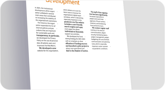 Organizational development In 2021, the institutional which allows us to use the - development of the organi - latest tools to improve the zation unfolded in several organization’s digital repre - increased. Specialists in main areas that contributed sentation, which is becoming project and event man - to increasing the stability of especially important in the agement, PR and commu - the organization’s operations. nications, and fundraising For instance, the organi - have joined the team. zation expanded the list of - internal policies and pro - ment page that allows training in the areas of cedures that are important communications, digital for sustainable work and support our activities. security, fundraising basics, We developed the Fund - project management, project we developed the Privacy raising Strategy for 2021-2023 budgeting, the use of remote Policy on the use of personal with an emphasis on diver - communication and planning data of website users and tools, which is especially improved the Risk Matrix. important under coronavi - attract non-grant funds enti - rus pandemic conditions. website for the organization,