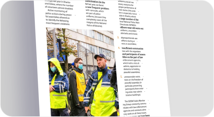people to the ranks of public 1. violations of the rules 2. poor quality of police monitors and held trainings concerning wearing for new volunteers. Our uniforms and personal uniforms and all nec - network grew especially essary resources for strongly last year in Kharkiv fall last year, we faced proper performance of and Odesa, where the number their duties (this prob - of volunteers almost doubled. with raincoats, which lem is especially notice - Active monitoring of are part of police able in Kharkiv, where police actions during peace - uniforms, because they ful assemblies allowed us completely cover all the local National Police Main to identify the following insignia of the National Directorate (NPMD)’s most frequent violations: Police of Ukraine); uniforms, uncomfort - able belts and shoes); 3. disproportionate use of force during ar - rests at assemblies; 4. - tion with the organizers - enforcement agencies, which led to crisis sit - uations, aggression or obstacles to holding peaceful assemblies; 5. unreasonable restric - tions on the freedom of peaceful assembly (in particular, preventing participants from enter - ing areas near admin - istrative buildings). The OZON Public Monitor - ing Group constantly commu - nicates with law enforcement agencies and conducts advo - cacy work on all these issues. able to get feedback from the police on our recommenda - tions, and the police repre - sentatives informed us that the recommendations had been incorporated in their