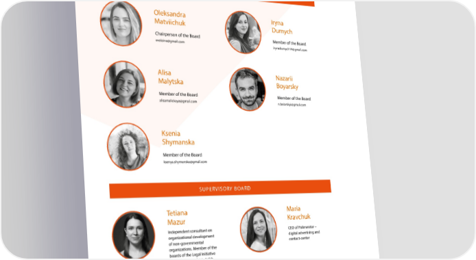 BOARD MEMBERS Oleksandra Iryna Matviichuk Dumych Chairperson of the Board Member of the Board avalaina@gmail.com irynadumych14@gmail.com Alisa Nazarii Malytska Boyarsky Member of the Board Member of the Board alisamalickaya@gmail.com n.boiarskyi@gmail.com Ksenia Shymanska Member of the Board ksenya.shymanska@gmail.com SUPERVISORY BOARD Tetiana Maria Mazur Kravchuk Independent consultant on CEO of Polimentor – organizational development digital advertising and of non-governmental contact-center organizations. Member of the boards of the Legal Initiative project and KyivPride NGO. Oleh Larysa Martynenko Denysenko Head of the analytical division Lawyer, human rights activist, writer. Member of the board and Rights Union. Director of the presenter at Hromadske Radio. UNDP Law Enforcement Research tolerance envoy in Ukraine. Member Center NGO. Doctor of Legal of the board at the International Sciences, criminologist. Renaissance Foundation.
