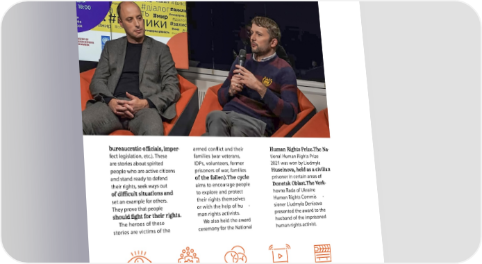 - armed conict and their - fect legislation, etc.). These families (war veterans, tional Human Rights Prize are stories about spirited IDPs, volunteers, former 2021 was won by Liudmyla people who are active citizens prisoners of war, families and stand ready to defend prisoner in certain areas of their rights, seek ways out aims to encourage people - to explore and protect hovna Rada of Ukraine set an example for others. their rights themselves Human Rights Commis - They prove that people or with the help of hu - sioner Liudmyla Denisova man rights activists. presented the award to the The heroes of these We also held the award husband of the imprisoned stories are victims of the ceremony for the National human rights activist. 6300 50 16 15 10 views expert panel hours of live short speakers discussions streaming documentary videos