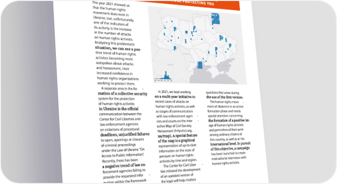 WWW.CCL.ORG.UA The year 2021 showed us that the human rights movement does exist in Ukraine, but, unfortunately, one of the indicators of its activity is the increase in the number of attacks on human rights activists. Analyzing this problematic - itive trend of human rights activists becoming more outspoken about attacks and harassment, their increased condence in human rights organizations working to protect them. A separate area in the for - In 2021, we kept working questions that arose during system for the protection record cases of attacks on The human rights move - of human rights activists human rights activists, as well ment of Ukraine is in an active communication between the as stages of communication formation phase and needs Center for Civil Liberties and with law enforcement agen - special attention concerning law enforcement agencies cies and courts on the Inter - - on violations of procedural active Map of Civil Society age of human rights activists Harassment (http://ccl.org. and promotion of their work to open, openings or closures among ordinary citizens of of criminal proceedings this country, as well as at the under the Law of Ukraine “On representation of up-to-date Access to Public Information”. information on the state of Recently, there has been pressure on human rights has been launched to create - activists by time and region. motivational interviews with forcement agencies failing to The Center for Civil Liber - human rights activists. provide the requested infor - ties initiated the development mation within the framework of an updated version of of this Law, which indicates the legal self-help chatbot that the system is still closed FightBack 2. Having analyzed despite populist statements user requests, we began work to the contrary. Such circum - on improving the resource, stances facilitate development focusing on legal aid in the - oversight mechanisms for dent and supplementing the law enforcement agencies. answers to the most common