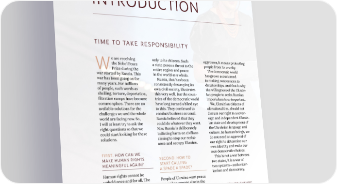 WWW.CCL.ORG.UA INTRODUCTION TIME TO TAKE RESPONSIBILITY e are receiving only to its citizens. Such aggressor, it means protecting the Nobel Peace a state poses a threat to the people from its cruelty. W Prize during the entire region and peace The democratic world war started by Russia. This in the world as a whole. has grown accustomed war has been going on for Russia, that has been to making concessions to many years. For millions consistently destroying its dictatorships. And that is why of people, such words as own civil society, illustrates the willingness of the Ukrain- shelling, torture, deportation, this very well. But the coun- ian people to resist Russian filtration camps have become tries of the democratic world imperialism is so important. commonplace. There are no have long turned a blind eye We, Ukrainian citizens of available solutions for the to this. They continued to all nationalities, should not challenges we and the whole conduct business as usual. discuss our right to a sover- world are facing now. So, Russia believed that they eign and independent Ukrain- I will at least try to ask the could do whatever they want. ian state and development of right questions so that we Now Russia is deliberately the Ukrainian language and could start looking for these inflicting harm on civilians culture. As human beings, we solutions. aiming to stop our resist- do not need an approval of ance and occupy Ukraine. our right to determine our own identity and make our FIRST. HOW CAN WE own democratic choices. MAKE HUMAN RIGHTS SECOND. HOW TO This is not a war between MEANINGFUL AGAIN? START CALLING two states, it is a war of A SPADE A SPADE? two systems – authoritar- Human rights cannot be ianism and democracy. upheld once and for all. The People of Ukraine want peace values of modern civilization more than anyone else in the must be protected. Peace, world. But peace cannot be THIRD. HOW TO ENSURE progress and human rights reached by country under PEACE FOR PEOPLE are inextricably linked. attack laying down its arms. AROUND THE WORLD? A state that kills journalists, This would not be peace, imprisons activists, or but occupation. Fighting The international system disperses peaceful demon- for peace does not mean of peace and security strations poses a threat not yielding to pressure of the does not work anymore. 4