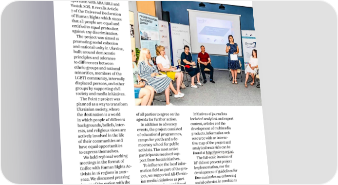 ANNUAL REPORT 2022 3. WORK WITHIN STRATEGIC AREAS AND HUMAN RIGHTS INITIATIVES POINT 7 This is the name we gave to a project implemented in co- operation with ABA ROLI and Vostok SOS. It recalls Article 7 of the Universal Declaration of Human Rights which states that all people are equal and entitled to equal protection against any discrimination. The project was aimed at promoting social cohesion and national unity in Ukraine, built around democratic principles and tolerance to differences between ethnic groups and national minorities, members of the LGBTI community, internally displaced persons, and other groups by supporting civil society and media initiatives. The Point 7 project was planned as a way to transform Ukrainian society, where the destination is a world of all parties to agree on the Initiatives of journalists in which people of different agenda for further action. included analytical and expert backgrounds, beliefs, inter- In addition to advocacy content, articles and the ests, and religious views are events, the project consisted development of multimedia actively involved in the life of educational programmes, products. Information web of their communities and camps for youth and a de- resource with an interac- have equal opportunities mocracy school for public tive map of the project and to express themselves. activists. The most active analytical materials can be We held regional working participants received sup- found at http://point7.org.ua. meetings in the format of port from local initiatives. The full-scale invasion of Coffee with Human Rights Ac- To influence the local infor- RF did not prevent project tivists in 16 regions in 2021– mation field as part of the pro- implementation, nor the 2022. We discussed pressing ject, we supported All-Ukrain- development of guidelines for issues of the region with the ian media initiatives as part line ministries on enhancing participation of local human of the first and second Equal social cohesion in conditions rights organisations, repre- and Free competitions. Based of martial law in Ukraine. sentatives of target groups, on the results of competitions, experts, and representatives cross-regional journalist of local authorities. The teams created and published regional events also aimed to materials aimed at overcom- build a dialogue between the ing stereotypes and raising most active representatives the level of national identity. 25