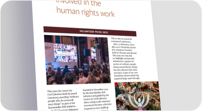 ANNUAL REPORT 2022 3. WORK WITHIN STRATEGIC AREAS AND HUMAN RIGHTS INITIATIVES 3.3. Getting the public involved in the human rights work VOLUNTEER PRIZE 2022 This is why we award all nominated volunteers. After 24 February, virtu- ally every Ukrainian joined the volunteer frontline both in Ukraine and abroad. This year, not only did we highlight and provide information support for stories of ordinary people doing extraordinary things, but also showed that volun- teering is a part of our new Ukrainian culture which has acquired large scale through This year, the Center for founded in November 2014 Civil Liberties held IX Award by the EuroMaidan SOS Ceremony awarding “ordinary initiative and guided by the people who do extraordi- Center for Civil Liberties nary things” as part of the when a large-scale volunteer Euromaidan SOS initiative. movement became a decisive IX All-Ukrainian Volunteer response to new challeng- Prize from EuroMaidan es. The Volunteer Prize is SOS initiative is a national the most popular award for non-governmental award volunteers in the country. for particular contribution It is annual and aimed in the volunteer movement at supporting volunteer in Ukraine for “ordinary movement in the coun- people who do extraordi- try and show society its nary things”. The Prize was importance and diversity. 21