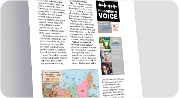 ANNUAL REPORT 2022 3. WORK WITHIN STRATEGIC AREAS AND HUMAN RIGHTS INITIATIVES The project specifically the unity of civil society to focused on continuous inter- release and return Ukrain- national advocacy concerning ians: both combatants and the release from captivity of civilians held in the RF. imprisoned civilians and the The CCL released analytical commitment of the aggressor materials on places and condi- state to observe the Geneva tions of prisoners’ detention. Conventions. Platforms for ad- This is a roadmap of system- vocacy: Oslo Freedom Forum, atic violations by Russia of the OSCE, UN Security Council, International humanitarian Council of Europe Parlia- law and Geneva Conventions. mentary Assembly, European We launched an interna- Court of Human Rights, UN tional campaign #releasewith- Human Rights Monitor- outconditionsandexchanges ing Mission, UK House of which is focused on direct and Commons, and Parliaments indirect pressure on the RF in of European countries. matters related to the imme- This topic was also raised by diate release of illegally im- Oleksandra Matviichuk, Head prisoned Ukrainian civilians. of the Center for Civil Liber- “25 true stories of ab- ties, during meetings with ductions of Ukrainians” — European country leaders a brochure released as part of and her speech at the Nobel the Prisoners Voice campaign. Peace Prize award ceremony. It contains real stories of At the Fourth International war-affected people, with the Forum on European Ukraine majority of them staying cap- in Berlin, the CCL made tive in the territory of RF. We a statement concerning shared this brochure, which was published in English and Ukrainian, among visitors to international events: representatives of civil society and political figures. In addition, the brochure is represented in the exhibition at the Nobel Prize Museum and Holocaust Memorial Museum in Washington. As part of the campaign, two press conferences were held with released civilian captives. We pro- vided the materials of over 17
