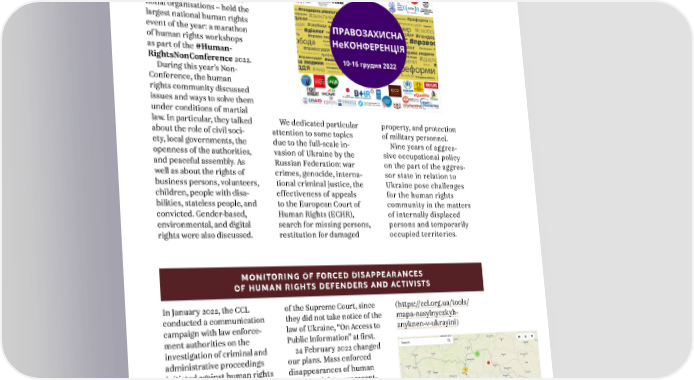 ANNUAL REPORT 2022 3. WORK WITHIN STRATEGIC AREAS AND HUMAN RIGHTS INITIATIVES For the seventh year in a row, the Center for Civil Lib- erties together with its part- ners – Ukrainian and interna- tional organisations – held the largest national human rights event of the year: a marathon of human rights workshops as part of the #Human- RightsNonConference 2022. During this year’s Non- Conference, the human rights community discussed issues and ways to solve them under conditions of martial law. In particular, they talked We dedicated particular property, and protection about the role of civil soci- attention to some topics of military personnel. ety, local governments, the due to the full-scale in- Nine years of aggres- openness of the authorities, vasion of Ukraine by the sive occupational policy and peaceful assembly. As Russian Federation: war on the part of the aggres- well as about the rights of crimes, genocide, interna- sor state in relation to business persons, volunteers, tional criminal justice, the Ukraine pose challenges children, people with disa- effectiveness of appeals for the human rights bilities, stateless people, and to the European Court of community in the matters convicted. Gender-based, Human Rights (ECHR), of internally displaced environmental, and digital search for missing persons, persons and temporarily rights were also discussed. restitution for damaged occupied territories. MONITORING OF FORCED DISAPPEARANCES OF HUMAN RIGHTS DEFENDERS AND ACTIVISTS In January 2022, the CCL of the Supreme Court, since (https://ccl.org.ua/tools/ conducted a communication they did not take notice of the mapa-nasylnyczkyh- campaign with law enforce- law of Ukraine, “On Access to znyknen-v-ukrayini) ment authorities on the Public Information” at first. investigation of criminal and 24 February 2022 changed administrative proceedings our plans. Mass enforced initiated against human rights disappearances of human activists, as well as proceed- rights activists, represent- ings initiated by human atives of local governments, rights activists. Following authorities, and religious the campaign results, law figures started in the tempo- enforcement provided rarily occupied territories. meaningful answers only Therefore, we developed and after repeated requests with started completing the Map reference to the Resolution of Enforced Disappearances 11