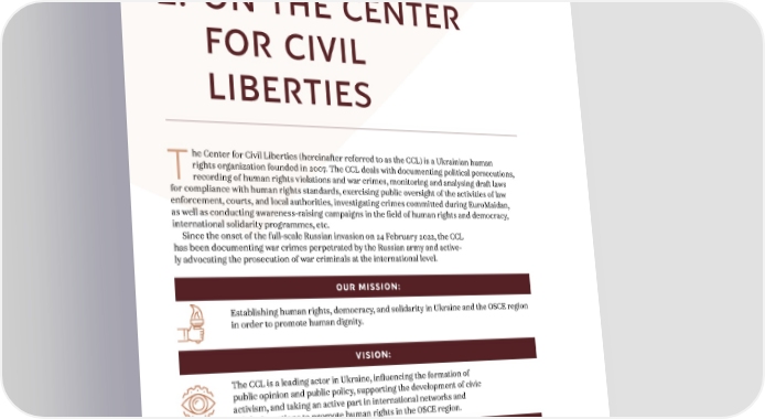 ANNUAL REPORT 2022 2. ON THE CENTER FOR CIVIL LIBERTIES 2. ON THE CENTER FOR CIVIL LIBERTIES he Center for Civil Liberties (hereinafter referred to as the CCL) is a Ukrainian human rights organization founded in 2007. The CCL deals with documenting political persecutions, T recording of human rights violations and war crimes, monitoring and analysing draft laws for compliance with human rights standards, exercising public oversight of the activities of law enforcement, courts, and local authorities, investigating crimes committed during EuroMaidan, as well as conducting awareness-raising campaigns in the field of human rights and democracy, international solidarity programmes, etc. Since the onset of the full-scale Russian invasion on 24 February 2022, the CCL has been documenting war crimes perpetrated by the Russian army and active- ly advocating the prosecution of war criminals at the international level. OUR MISSION: Establishing human rights, democracy, and solidarity in Ukraine and the OSCE region in order to promote human dignity. VISION: The CCL is a leading actor in Ukraine, influencing the formation of public opinion and public policy, supporting the development of civic activism, and taking an active part in international networks and solidarity actions to promote human rights in the OSCE region. OUR VALUES: respect for human dignity; freedom and human rights; solidarity; rule of law; impartiality; democracy; non-discrimination. 7