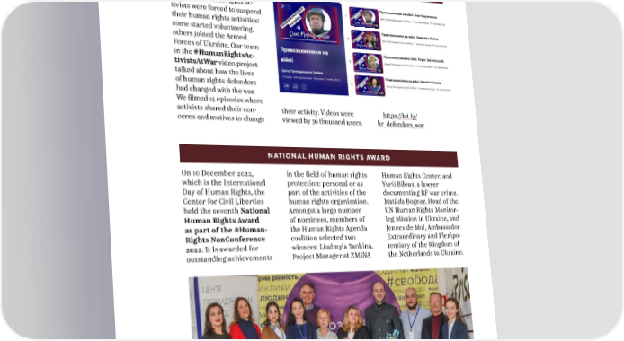 WWW.CCL.ORG.UA HUMAN RIGHTS ACTIVISTS AT WAR Due to the full-scale war, Ukrainian human rights ac- tivists were forced to suspend their human rights activities: some started volunteering, others joined the Armed Forces of Ukraine. Our team in the #HumanRightsAc- tivistsAtWar video project talked about how the lives of human rights defenders had changed with the war. We filmed 15 episodes where activists shared their con- their activity. Videos were https://bit.ly/ cerns and motives to change viewed by 36 thousand users. hr_defenders_war NATIONAL HUMAN RIGHTS AWARD On 10 December 2022, in the field of human rights Human Rights Center, and which is the International protection: personal or as Yurii Bilous, a lawyer Day of Human Rights, the part of the activities of the documenting RF war crime. Center for Civil Liberties human rights organisation. Matilda Bogner, Head of the held the seventh National Amongst a large number UN Human Rights Monitor- Human Rights Award of nominees, members of ing Mission in Ukraine, and as part of the #Human- the Human Rights Agenda Jennes de Mol, Ambassador Rights NonConference coalition selected two Extraordinary and Plenipo- 2022. It is awarded for winners: Liudmyla Yankina, tentiary of the Kingdom of outstanding achievements Project Manager at ZMINA the Netherlands to Ukraine. 12