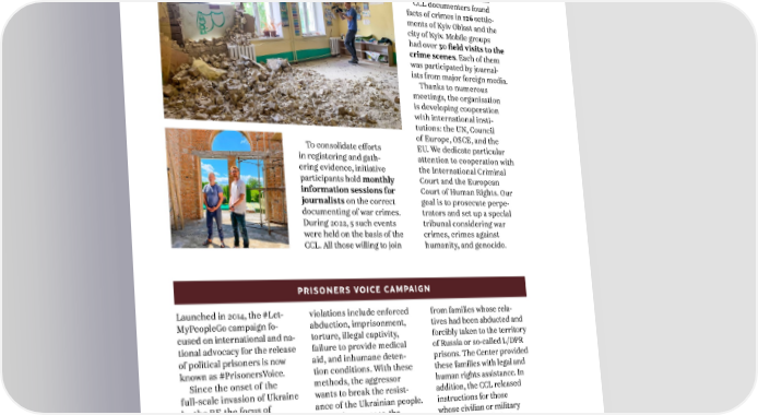 ANNUAL REPORT 2022 3. WORK WITHIN STRATEGIC AREAS AND HUMAN RIGHTS INITIATIVES the process as volunteers are also given instructions. CCL documenters found facts of crimes in 126 settle- ments of Kyiv Oblast and the city of Kyiv. Mobile groups had over 30 field visits to the crime scenes. Each of them was participated by journal- ists from major foreign media. Thanks to numerous meetings, the organisation is developing cooperation with international insti- tutions: the UN, Council of Europe, OSCE, and the To consolidate efforts EU. We dedicate particular in registering and gath- attention to cooperation with ering evidence, initiative the International Criminal participants hold monthly Court and the European information sessions for Court of Human Rights. Our journalists on the correct goal is to prosecute perpe- documenting of war crimes. trators and set up a special During 2022, 5 such events tribunal considering war were held on the basis of the crimes, crimes against CCL. All those willing to join humanity, and genocide. PRISONERS VOICE CAMPAIGN Launched in 2014, the #Let- violations include enforced from families whose rela- MyPeopleGo campaign fo- abduction, imprisonment, tives had been abducted and cused on international and na- torture, illegal captivity, forcibly taken to the territory tional advocacy for the release failure to provide medical of Russia or so-called L/DPR of political prisoners is now aid, and inhumane deten- prisons. The Center provided known as #PrisonersVoice. tion conditions. With these these families with legal and Since the onset of the methods, the aggressor human rights assistance. In full-scale invasion of Ukraine wants to break the resist- addition, the CCL released by the RF, the focus of ance of the Ukrainian people. instructions for those Prisoners Voice’s attention In February 2022, the whose civilian or military shifted to the protection winter letter marathon for relatives were missing. of the rights of people who Ukrainian political prisoners Together with its partners, were captured as a result of of the Kremlin took place. the CCL created working Russian aggression: these Over 200 letters have been groups for effective legal are imprisoned civilians and written to political prisoners. aid to victims, as well as war prisoners whose rights During 2022, the CCL ensuring that their appeals are grossly violated. These received about 800 requests are represented in the ECHR 15
