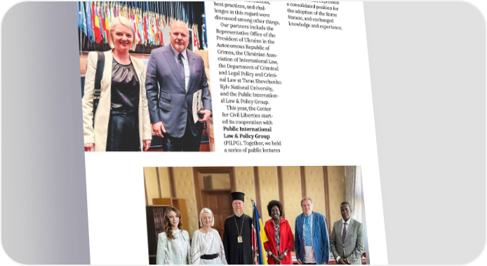 WWW.CCL.ORG.UA 2022), where issues of the on international humani- implementation of the Rome tarian law (IHL), expressed Statute and achievements, a consolidated position for best practices, and chal- the adoption of the Rome lenges in this regard were Statute, and exchanged discussed among other things. knowledge and experience. Our partners include the Representative OfÏce of the President of Ukraine in the Autonomous Republic of Crimea, the Ukrainian Asso- ciation of International Law, the Department of Criminal and Legal Policy and Crimi- nal Law at Taras Shevchenko Kyiv National University, and the Public Internation- al Law & Policy Group. This year, the Center for Civil Liberties start- ed its cooperation with Public International Law & Policy Group (PILPG). Together, we held a series of public lectures 20