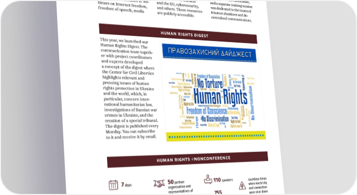 WWW.CCL.ORG.UA Kyiv School of Human literacy, critical thinking Russia’s full-scale invasion Rights has launched the development, legislation on has adjusted the curriculum, Internet Freedom Club personal data in Ukraine and a separate training session course, which includes 10 we- and the EU, cybersecurity, was dedicated to the issues of binars on Internet freedom, and others. These resources Internet shutdown and de- freedom of speech, media are publicly accessible. centralised communications. HUMAN RIGHTS DIGEST This year, we launched our Human Rights Digest. The communication team togeth- er with project coordinators and experts developed a concept of the digest where the Center for Civil Liberties highlights relevant and pressing issues of human rights protection in Ukraine and the world, which, in particular, concern inter- national humanitarian law, investigations of Russian war crimes in Ukraine, and the creation of a special tribunal. The digest is published every Monday. You can subscribe to it and receive it by email. HUMAN RIGHTS #NONCONFERENCE 7 days 50 partner 110 speakers countless times organisation and when electricity representatives of and connection 31 workshops state authorities 755 were shut down moderated by views on 31 moderators YouTube sign 106 times air 2571 language 48 hours of raid alarm was registered translation announced during participants live broadcast the live broadcast 10