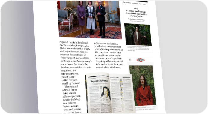 WWW.CCL.ORG.UA regional media in South and agencies and institutions, North America, Europe, Asia, enables free communication Africa wrote about this event, with ofÏcial representatives of making millions of readers the respective nations, such aware of the problems of as presidents, prime minis- observance of human rights ters, members of royal fami- in Ukraine, the Russian army’s lies, along with conveyance of war crimes, the need to be information about the actual held accountable for commit- state of affairs with human ting them, and the global threat posed to the entire civilised world by this war. The status of a Nobel Peace Prize winner offers opportuni- ties for building real bridges between coun- tries and people, opens the doors to international 32