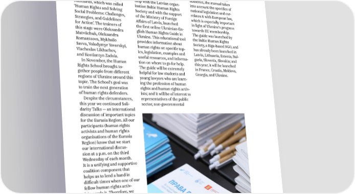 ANNUAL REPORT 2023 3. WORK WITHIN STRATEGIC AREAS AND HUMAN RIGHTS INITIATIVES In the summer, we also held HUMAN RIGHTS GUIDE organisations, and academia. the 2nd level of the Human Developed for a Ukrainian Rights Course based on In 2023, the CCL, in partner- audience, the manual takes international human rights ship with the Latvian organ- into account the specifics of standards, which was called isation Baltic Human Rights national legislation and cor- ‘Human Rights and Solving Society and with the support relates it with European law, Social Problems: Challenges, of the Ministry of Foreign which is especially important Strategies, and Guidelines Affairs of Latvia, launched in light of Ukraine‘s progress for Action’. The trainers of the first online Ukrainian-En- towards EU membership. this stage were Oleksandra glish Human Rights Guide in The guide was launched by Matviichuk, Oleksandra Ukraine. This educational tool the Baltic Human Rights Romantsova, Mykhailo provides information about Society, a Riga-based NGO, and Savva, Volodymyr Yavorskyi, human rights on specific top- has already been launched in Viacheslav Likhachov, ics, legislation, examples and Latvia, Lithuania, Estonia, Bul- and Kostiantyn Zadoia. useful resources, and informa- garia, Slovenia, Slovakia; and In November, the Human tion on where to go for help. this year, it will be launched Rights School brought to- The guide will be extremely in France, Croatia, Moldova, gether people from different helpful for law students and Georgia, and Ukraine. regions of Ukraine around this young lawyers who are learn- topic. The School‘s goal was ing the profession of human to train the next generation rights and human rights activ- of human rights defenders. ists; and it will be of interest to Despite the circumstances, representatives of the public this year we continued Soli- sector, non-governmental darity Talks — an international discussion of important topics for the Eurasia Region. All our participants (human rights activists and human rights organisations of the Eurasia Region) know that we start our international discus- sion at 2 p.m. on the third Wednesday of each month. It is a unifying and supportive coalition component that helps us to lend a hand in difÏcult times when one of our fellow human rights activ- ists needs it. Therefore, we continue this activity in 2024. 31