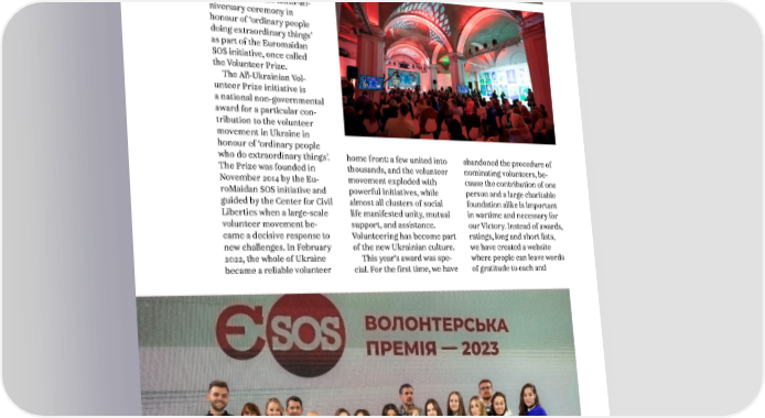 WWW.CCL.ORG.UA VOLUNTEER PRIZE 2023 This year, the Center for Civil Liberties held the tenth-an- niversary ceremony in honour of ‘ordinary people doing extraordinary things’ as part of the Euromaidan SOS initiative, once called the Volunteer Prize. The All-Ukrainian Vol- unteer Prize initiative is a national non-governmental award for a particular con- tribution to the volunteer movement in Ukraine in honour of ‘ordinary people who do extraordinary things’. home front: a few united into abandoned the procedure of The Prize was founded in thousands, and the volunteer nominating volunteers, be- November 2014 by the Eu- movement exploded with cause the contribution of one roMaidan SOS initiative and powerful initiatives, while person and a large charitable guided by the Center for Civil almost all clusters of social foundation alike is important Liberties when a large-scale life manifested unity, mutual in wartime and necessary for volunteer movement be- support, and assistance. our Victory. Instead of awards, came a decisive response to Volunteering has become part ratings, long and short lists, new challenges. In February of the new Ukrainian culture. we have created a website 2022, the whole of Ukraine This year‘s award was spe- where people can leave words became a reliable volunteer cial. For the first time, we have of gratitude to each and 26