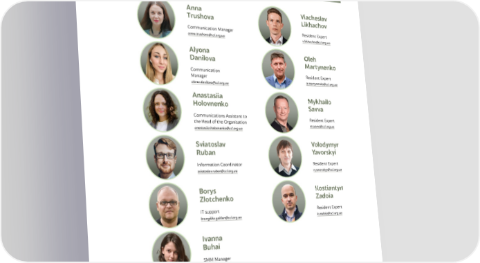 WWW.CCL.ORG.UA PARTNER TEAM EXPERT COUNCIL Anna Viacheslav Trushova Likhachov Communication Manager Resident Expert anna.trushova@ccl.org.ua v.likhachev@ccl.org.ua Alyona Oleh Danilova Martynenko Communication Resident Expert Manager o.martynenko@ccl.org.ua alona.danilova@ccl.org.ua Anastasiia Mykhailo Holovnenko Savva Communications Assistant to Resident Expert the Head of the Organisation m.savva@ccl.org.ua anastasiia.holovnenko@ccl.org.ua Sviatoslav Volodymyr Ruban Yavorskyi Information Coordinator Resident Expert sviatoslav.ruban@ccl.org.ua v.yavorskyy@ccl.org.ua Borys Kostiantyn Zlotchenko Zadoia IT support Resident Expert brungilda.golden@ccl.org.ua k.zadoia@ccl.org.ua Ivanna Buhai SMM Manager ivanna.buhai@ccl.org.ua Tetiana Kapustynska Copywriter tetiana.kapustynska@ccl.org.ua 46