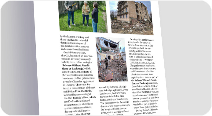 WWW.CCL.ORG.UA by the Russian military and On 28 April, a performance those involved in unlawful took place in the centre of detention (employees of Kyiv to draw attention to this pre-trial detention centres crucial topic, both for our and correctional facilities). society and the European On 28 February 2023, one. It focused on the re- the CCL launched an informa- turn of unlawfully detained tion and advocacy campaign civilians home — WITHOUT to help free civilian hostages, CONDITIONS or EXCHANGE. ‘Release Without Condi- The performance was based tions or Exchange’, which on evidence of abuse, torture, aimed to unite the efforts of and ill-treatment of civilian the international community Ukrainians released from to release civilian prisoners as captivity. On 24 June, as part of a result of Russian aggression the Release Without Condi- in Ukraine. The event fea- tions or Exchange campaign, tured a presentation of the art unlawfully detained Ukraini- the 11th International Book Ar- exhibition Free the Birds, ans: Valentyn Vyhivskyi, Iryna senal Festival hosted a discus- followed by a screening of Danylovych, Serhii Tsyhipa, sion titled ‘WOMEN‘S VOICES: the film Victoria‘s Voice, which Nariman Dzhelialov, Riza a confession story of released testified to the enforced Izetov, and Iryna Horobtsova. women prisoners of war about disappearances of civilians The project reveals the whole Russian captivity’. The event and detention conditions drama of the captives through was held as part of the Pris- during unlawful impris- the images of birds in cap- oner‘s Voice global initiative. onment. Later, the Free tivity, which may die without During Russia‘s full-scale the Birds art project was our deliberate support. invasion of Ukraine, over presented and exhibited in Kyiv at the Artistic Passage (38 Khreshchatyk Street). The protagonists of the art project were six civilians who are held in Russian captivity as political prisoners and 16