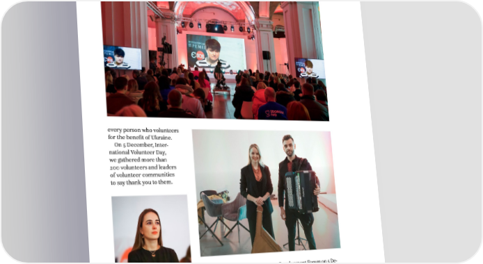 ANNUAL REPORT 2023 3. WORK WITHIN STRATEGIC AREAS AND HUMAN RIGHTS INITIATIVES every person who volunteers for the benefit of Ukraine. On 5 December, Inter- national Volunteer Day, we gathered more than 200 volunteers and leaders of volunteer communities to say thank you to them. The Volunteer Prize Development Forum on 5 De- 2023 was jointly organised cember 2023 with support from by the Center for Civil Liber- ISAR Ednannia. Our partners, ties, the Ukrainian Volunteer Media Center Ukraine, provid- Service, and the Ukrainian ed information support and Women‘s Battalion. The award created a documentary film ceremony took place as about the history of the Volun- part of the 12th Civil Society teer Prize From Tens to Millions. 27