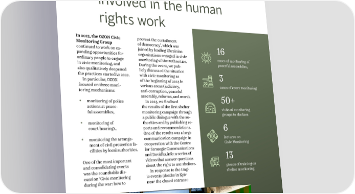 ANNUAL REPORT 2023 3. WORK WITHIN STRATEGIC AREAS AND HUMAN RIGHTS INITIATIVES 3.3. Getting the public involved in the human rights work In 2023, the OZON Civic prevent the curtailment Monitoring Group of democracy’, which was 16 continued to work on ex- joined by leading Ukrainian panding opportunities for organisations engaged in civic cases of monitoring of ordinary people to engage monitoring of the authorities. peaceful assemblies, in civic monitoring, and During the event, we pub- also qualitatively deepened licly discussed the situation the practices started in 2022. with civic monitoring as 3 In particular, OZON of the beginning of 2023 in focused on three moni- various areas (judiciary, cases of court monitoring toring mechanisms: anti-corruption, peaceful • monitoring of police assembly, reforms, and more). 50+ In 2023, we finalised actions at peace- the results of the first shelter visits of monitoring ful assemblies, monitoring campaign through groups to shelters • monitoring of a public dialogue with the au- thorities and by publishing re- court hearings, ports and recommendations. 6 • monitoring the arrange- One of the results was a large lectures on communication campaign in ment of civil protection fa- cooperation with the Centre Civic Monitoring cilities by local authorities. for Strategic Communications and Dovidka.info: a series of 13 One of the most important videos that answer questions and consolidating events about the right to use shelters. pieces of training on was the roundtable dis- In response to the trag- shelter monitoring cussion ‘Civic monitoring ic events (deaths in Kyiv during the war: how to near the closed entrance 21