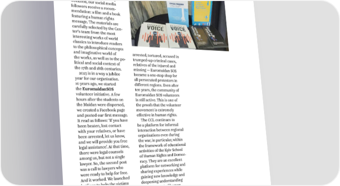 ANNUAL REPORT 2023 3. WORK WITHIN STRATEGIC AREAS AND HUMAN RIGHTS INITIATIVES We also launched a new ed- ucational campaign this year. It is called ‘Human Rights: A Book and a Film’. Every weekend, our social media followers receive a recom- mendation: a film and a book featuring a human rights message. The materials are carefully selected by the Cen- ter‘s team from the most interesting works of world classics to introduce readers to the philosophical concepts and imaginative world of arrested, tortured, accused in the works, as well as to the po- trumped-up criminal cases, litical and social context of relatives of the injured and the 17th and 18th centuries. missing — Euromaidan SOS 2023 is in a way a jubilee became a one-stop shop for year for our organisation. all persecuted protesters in 10 years ago, we started different regions. Even after the EuromaidanSOS ten years, the community of volunteer initiative. A few Euromaidan SOS volunteers hours after the students on is still active. This is one of the Maidan were dispersed, the proofs that the volunteer we created a Facebook page movement is extremely and posted our first message. effective in human rights. It read as follows: ‘If you have The CCL continues to been beaten, lost contact be a platform for informal with your relatives, or have interaction between regional been arrested, let us know, organisations even during and we will provide you free the war, in particular, within legal assistance’. At that time, the framework of educational there were legal counsels activities of the Kyiv School among us, but not a single of Human Rights and Democ- lawyer. So, the second post racy. They are an excellent was a call to lawyers who platform for networking and were ready to help for free. sharing experiences while And it worked. We launched gaining new knowledge and hotlines to help the victims deepening understanding on the night of 30 Novem- of the concept of human ber 2013. Later, the number rights and related topics. of people in need of help increased, and we worked 24 hours a day for several months. We provided help and support to over 16,000 people. Beaten, illegally detained or 13