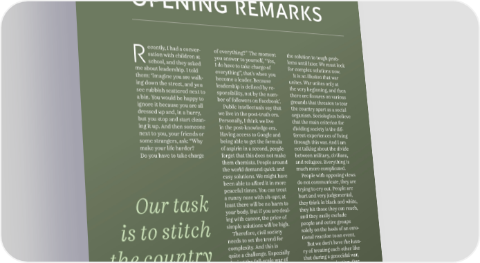 WWW.CCL.ORG.UA OPENING REMARKS ecently, I had a conver- of everything?” The moment the solution to tough prob- R sation with children at you answer to yourself, “Yes, lems until later. We must look school, and they asked I do have to take charge of for complex solutions now. me about leadership. I told everything”, that’s when you It is an illusion that war them: ‘Imagine you are walk- become a leader. Because unites. War unites only at ing down the street, and you leadership is defined by re- the very beginning, and then see rubbish scattered next to sponsibility, not by the num- there are fissures on various a bin. You would be happy to ber of followers on Facebook’. grounds that threaten to tear ignore it because you are all Public intellectuals say that the country apart as a social dressed up and, in a hurry, we live in the post-truth era. organism. Sociologists believe but you stop and start clean- Personally, I think we live that the main criterion for ing it up. And then someone in the post-knowledge era. dividing society is the dif- next to you, your friends or Having access to Google and ferent experiences of living some strangers, ask: “Why being able to get the formula through this war. And I am make your life harder? of aspirin in a second, people not talking about the divide Do you have to take charge forget that this does not make between military, civilians, them chemists. People around and refugees. Everything is the world demand quick and much more complicated. easy solutions. We might have People with opposing views been able to afford it in more do not communicate, they are peaceful times. You can treat trying to cry out. People are a runny nose with sit-ups; at hurt and very judgemental, Our task least there will be no harm to they think in black and white, your body. But if you are deal- they hit those they can reach, ing with cancer, the price of and they easily exclude is to stitch simple solutions will be high. people and entire groups Therefore, civil society solely on the basis of an emo- needs to set the trend for tional reaction to an event. complexity. And this is But we don‘t have the luxu- the country quite a challenge. Especially ry of treating each other like during the full-scale war of that during a genocidal war, extermination that Russia a war of extermination. Our together has waged. And we don‘t task is to stitch the country know whether we are in together. There are two types the middle, at the end, or just of social capital. The first is at the beginning of this war. called ‘bond’ and involves in- That is why we do not have teraction within a group. But the luxury of postponing you can‘t build a country that 4Our task is to stitch the country together