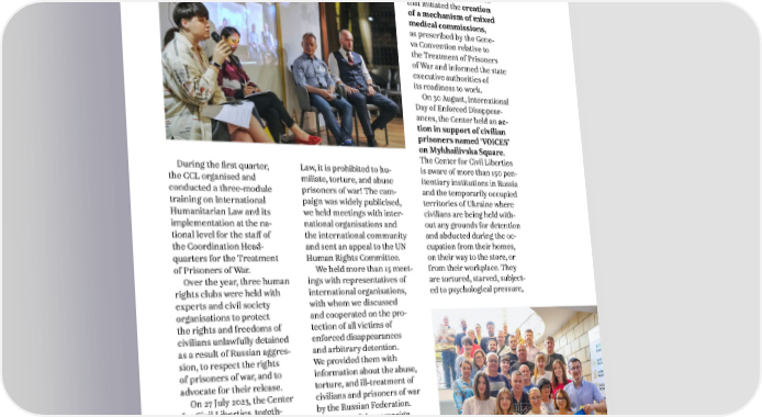 ANNUAL REPORT 2023 3. WORK WITHIN STRATEGIC AREAS AND HUMAN RIGHTS INITIATIVES The Center for Civil Lib- erties was one of the NGOs that initiated the creation of a mechanism of mixed medical commissions, as prescribed by the Gene- va Convention relative to the Treatment of Prisoners of War and informed the state executive authorities of its readiness to work. On 30 August, International Day of Enforced Disappear- ances, the Center held an ac- tion in support of civilian prisoners named ‘VOICES’ on Mykhailivska Square. The Center for Civil Liberties During the first quarter, Law, it is prohibited to hu- is aware of more than 150 pen- the CCL organised and miliate, torture, and abuse itentiary institutions in Russia conducted a three-module prisoners of war! The cam- and the temporarily occupied training on International paign was widely publicised, territories of Ukraine where Humanitarian Law and its we held meetings with inter- civilians are being held with- implementation at the na- national organisations and out any grounds for detention tional level for the staff of the international community and abducted during the oc- the Coordination Head- and sent an appeal to the UN cupation from their homes, quarters for the Treatment Human Rights Committee. on their way to the store, or of Prisoners of War. We held more than 15 meet- from their workplace. They Over the year, three human ings with representatives of are tortured, starved, subject- rights clubs were held with international organisations, ed to psychological pressure, experts and civil society with whom we discussed organisations to protect and cooperated on the pro- the rights and freedoms of tection of all victims of civilians unlawfully detained enforced disappearances as a result of Russian aggres- and arbitrary detention. sion, to respect the rights We provided them with of prisoners of war, and to information about the abuse, advocate for their release. torture, and ill-treatment of On 27 July 2023, the Center civilians and prisoners of war for Civil Liberties, togeth- by the Russian Federation. er with the NGO Military As part of the campaign Medics of Ukraine, launched for the release of prisoners, a large-scale information more than 500 letters from and advocacy campaign to relatives of prisoners of ensure the rights of captured war and illegally detained medics as a result of the Rus- civilians from Crimea and sian-Ukrainian war. According other regions of Ukraine to International Humanitarian were delivered to the Pope. 19
