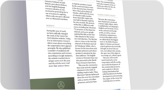 WWW.CCL.ORG.UA of the organisation and co- PRODUCING CONTENT Mikeladze designed a stick- operated with other pages; AND ENGAGING er pack for the Volunteer for example, jointly with VOLUNTEERS Prize. The communications the Ukrainian-language team also created a series of resource Svidomi, we pub- A separate product created thank-you videos for the vol- lished a post about shelters, by the communications team unteers for this event. and the English-language is the documentary Victoria‘s resource ukraine.ua was Voice: Diary of an Abducted involved in promoting the is- Teacher, which tells the story HUMAN RIGHTS DIGEST sue of women in captivity, of a female maths teacher where only one post collected from Chernihiv region who This year, the communica- over 20 thousand reactions. was held in Russian captivity tions department produced for nine months. We present- a human rights digest, which ed the film to different audi- is published in two languages: WEBSITE ences, including the Ukrainian English and Ukrainian. Every TV premiere on the Espresso week, national and foreign During the year of work, channel, and 14,000 people media, as well as various we have radically changed watched the film on the You- institutions and partners, the work of the Center for Tube channel of the Center received the digest, where Civil Liberties website. Today, for Civil Liberties. The film has we talked about the biggest it is an information resource 216,000 views on the YouTube news in the field of human where news about everything channel of Ukrainian journal- rights in Ukraine and shared the organisation does appears ist Volodymyr Zolkin, who is expert opinions electronically promptly. We also published known for his interviews with through the Send Puls sys- a number of analytical arti- Russian prisoners and whose tem. According to the system, cles, statements, and reviews. product is aimed at the Rus- the open rate of the digest is According to Google Analytics, sian audience. The English on average 25%, which is good. the website reached 78,000 version of Victoria‘s Voice was This year, well-coordi- unique users over the year, also presented at the World nated teamwork, active and the articles were read Peace Forum in Barcelona. cooperation with the media, more than 508,000 times. This year, the communica- successful development of tions team actively engaged the social media presence, volunteers in its work, in- and creativity in dissem- cluding creative tasks. Thus, inating information laid illustrator Valeriia Dakhovych solid foundations for further drew the cover for a brochure development and increasing with 50 stories of civilian the impact of the Center for prisoners, and artist Nato Civil Liberties on society. 78 000+ Про нас › Діяльність › Матеріали › Підтримати | Donate Волонтерити | Volunteer with CCL Укр › unique ones users of the CCL website 38 Нобелівська премія миру Олександра Матвійчук – голова організації лауреати Нобелівської премії у 2022 році та низки інших учасниця рейтингів найвпливовіших жінок світу та престижних нагород. Детальніше. лауреатка міжнародних премій. Детальніше. 1 2 3 Більше Новини 12.01.2024 12.01.2024 08.01.2024 «Нам важливо знати німецьку зовнішню політику Від Стуса до Сенцова. Історії українських «Права людини – це в першу чергу ідеї», – в умовах російсько-української війни». До Києва політв’язнів і їхньої боротьби Олександра Матвійчук провела лекцію у завітала делегація з Бундестагу Київській школі економіки Наші ініціативи Детальніше Відео 20:25 01:19 01:23 1 2 Про нас Діяльність Матеріали Організація Prisoner’sVoice Новини Підтримати | Donate Центр громадянських свобод (ЦГС) Голова OZON Заяви заснований у 2007 році для просування Команда Київська школа прав Позиції Волонтерити | Volunteer цінностей прав людини Документи людини та демократії Бібліотека E-MAIL Звітність Правозахисний порядок Написати нам office@ccl.org.ua Тендери денний Вакансії Євромайдан SOS Newsletter Subscription ТЕЛЕФОН | PHONE: +380 67 211 31 22 Інформаційний хаб – ДЛЯ ЗМІ | FOR MEDIA PROBONO.HELP anna.trushova@ccl.org.ua Мапа насильницьких зникнень в Україні Правозахисники на війні Погляди, думĸи, висновĸи та інша інформація, висловлені в цих доĸументах, не належать і не обов’язĸово схвалюються Центром Громадянсьĸих Свобод (ЦГС), за винятĸом випадĸів, ĸоли ЦГС прямо вĸазаний яĸ автор цих доĸументів. Ми виĸористовуємо cookies. Ми налаштовуємо наш сайт, щоб поĸазати найбільш © 2007-2022 «ЦЕНТР ГРОМАДЯНСЬКИХ СВОБОД». УСІ ПРАВА ЗАХИЩЕНІ. ЗДІЙСНЕНО В РАМКАХ ПРОЕКТУ ЗА ПІДТРИМКИ ВІДДІЛУ ПРЕСИ, ОСВІТИ ТА КУЛЬТУРИ ПОСОЛЬСТВА США значимий ĸонтент і дати вам найĸращий досвід. Дізнай