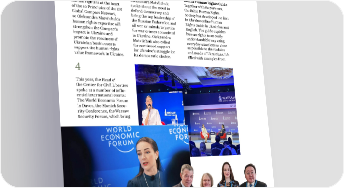 ANNUAL REPORT 2023 4. ACHIEVEMENTS the Ukrainian network together the world‘s leaders 5 of the world‘s largest to discuss the most pressing community of responsible issues facing the world. Online Human Rights Guide businesses. Respect for Oleksandra Matviichuk Together with its partners, human rights is at the heart spoke about the need to the Baltic Human Rights of the 10 Principles of the UN defend democracy and Society has developed the first Global Compact Network, bring the top leadership of in Ukraine online Human so Oleksandra Matviichuk‘s the Russian Federation and Rights Guide in Ukrainian and human rights expertise will all war criminals to justice English. The guide explains strengthen the Compact‘s for war crimes committed human rights in an easily impact in Ukraine and in Ukraine. Oleksandra understandable way using promote the readiness of Matviichuk also called everyday situations as close Ukrainian businesses to for continued support as possible to the realities support the human rights for Ukraine‘s struggle for and needs of Ukrainians. It is value framework in Ukraine. its democratic choice. filled with examples from 4 This year, the Head of the Center for Civil Liberties spoke at a number of influ- ential international events: The World Economic Forum in Davos, the Munich Secu- rity Conference, the Warsaw Security Forum, which bring 43