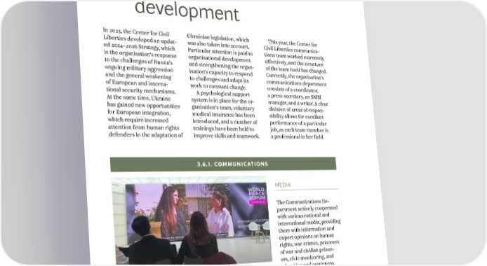 ANNUAL REPORT 2023 3. WORK WITHIN STRATEGIC AREAS AND HUMAN RIGHTS INITIATIVES 3.6 Organisational development In 2023, the Center for Civil Ukrainian legislation, which This year, the Center for Liberties developed an updat- was also taken into account. Civil Liberties communica- ed 2024–2026 Strategy, which Particular attention is paid to tions team worked extremely is the organisation‘s response organisational development effectively, and the structure to the challenges of Russia‘s and strengthening the organ- of the team itself has changed. ongoing military aggression isation‘s capacity to respond Currently, the organisation‘s and the general weakening to challenges and adapt its communications department of European and interna- work to constant change. consists of a coordinator, tional security mechanisms. A psychological support a press secretary, an SMM At the same time, Ukraine system is in place for the or- manager, and a writer. A clear has gained new opportunities ganisation‘s team, voluntary division of areas of respon- for European integration, medical insurance has been sibility allows for excellent which require increased introduced, and a number of performance of a particular attention from human rights trainings have been held to job, as each team member is defenders in the adaptation of improve skills and teamwork. a professional in her field. 3.6.1. COMMUNICATIONS MEDIA The Communications De- partment actively cooperated with various national and international media, providing them with information and expert opinions on human rights, war crimes, prisoners of war and civilian prison- ers, civic monitoring, and education and awareness. This year, the Center for Civil team used a variety of According to the Se- Liberties has been engaged channels, including its mantic Force monitoring in various communication website and social media, system, the Center for Civil activities aimed at spreading as well as press releases, Liberties was mentioned in information about the impor- engaging media partners Ukrainian and English tance of human rights pro- to cover public events and more than 13 thousand tection. The communications creating publications. times in various media and 35