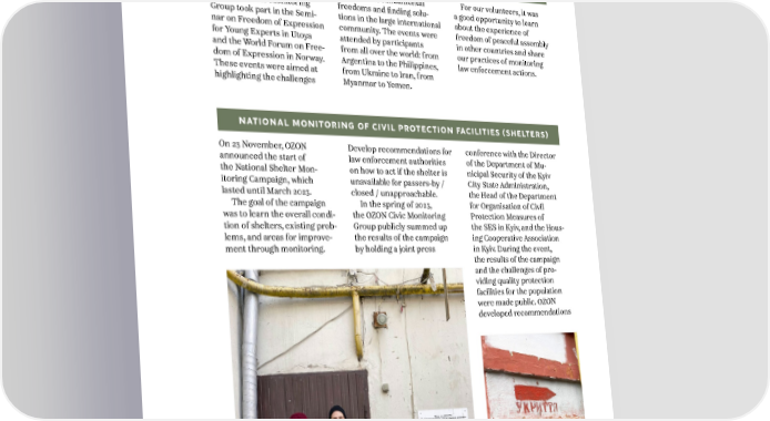 WWW.CCL.ORG.UA INTERNATIONAL EXPERIENCE This year, the volunteers of to one of the fundamental For our volunteers, it was the OZON Civic Monitoring freedoms and finding solu- a good opportunity to learn Group took part in the Semi- tions in the large international about the experience of nar on Freedom of Expression community. The events were freedom of peaceful assembly for Young Experts in Utoya attended by participants in other countries and share and the World Forum on Free- from all over the world: from our practices of monitoring dom of Expression in Norway. Argentina to the Philippines, law enforcement actions. These events were aimed at from Ukraine to Iran, from highlighting the challenges Myanmar to Yemen. NATIONAL MONITORING OF CIVIL PROTECTION FACILITIES (SHELTERS) On 23 November, OZON Develop recommendations for conference with the Director announced the start of law enforcement authorities of the Department of Mu- the National Shelter Mon- on how to act if the shelter is nicipal Security of the Kyiv itoring Campaign, which unavailable for passers-by / City State Administration, lasted until March 2023. closed / unapproachable. the Head of the Department The goal of the campaign In the spring of 2023, for Organisation of Civil was to learn the overall condi- the OZON Civic Monitoring Protection Measures of tion of shelters, existing prob- Group publicly summed up the SES in Kyiv, and the Hous- lems, and areas for improve- the results of the campaign ing Cooperative Association ment through monitoring. by holding a joint press in Kyiv. During the event, the results of the campaign and the challenges of pro- viding quality protection facilities for the population were made public. OZON developed recommendations 24