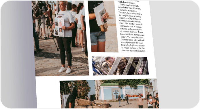 WWW.CCL.ORG.UA in the temporarily occu- pied territories of Donetsk and Luhansk Oblasts. The Center for Civil Lib- erties held a joint side event Victim-Centred Justice: Ukraineās Experience in New York as part of the meeting of the Assembly of States of the International Criminal Court. The meeting focused on the detention of civilians in Russia and the occupied territories, improper deten- tion conditions, filtration, and torture. They also discussed the need for an international investigation and the need to develop legal mechanisms to return civilians to Ukraine from the Russian Federation. 18