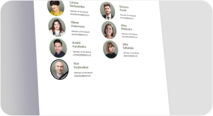 ANNUAL REPORT 2023 5. OUR TEAM BOARD Larysa Dmytro Denysenko Koval Member of the Board Member of the Board denysenko.larysa@gmail.com dm.o.koval@gmail.com Olena Alisa Kaiumova Malytska Member of the Board Member of the Board kayumovaef@gmail.com alisamalickaya@gmail.com Andrii Olha Kyrylenko Sahaidak Member of the Board Member of the Board a.kirilenko1980@gmail.com olga.korners@gmail.com Ihor Kozlovskyi Member of the Board kozlovskyyia@gmail.com 47